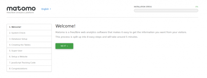 اگر همه چیز درست باشد، صفحه شروع نصب Matomo نمایش داده میشود.