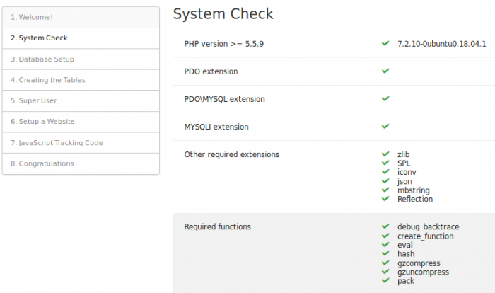 Matomo به صورت خودکار بررسی میکند که سرور شما تمام پیشنیازها (نسخه PHP، ماژولهای لازم و دسترسیها) را دارد یا خیر. اگر مشکلی باشد، در همین صفحه نمایش داده میشود و باید آنها را رفع کنید (مثل فعال کردن ماژولهای PHP مورد نیاز).