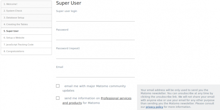 در این مرحله از نصب Matomo، باید یک حساب کاربری ادمین (super user) بسازید:
