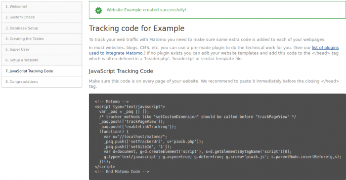 در پایان نصب، Matomo کد JavaScript رهگیری را نمایش میدهد.